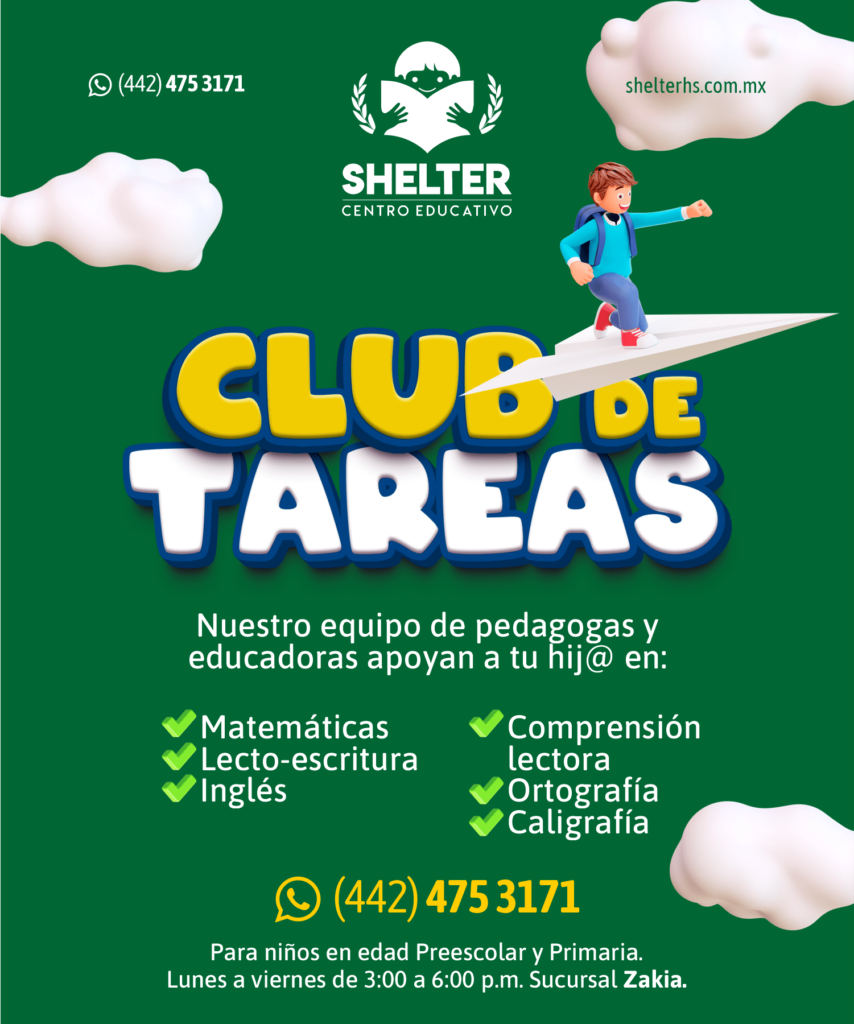 En Shelter Centro Educativo, nuestro Club de Tareas y Regularización ofrece un espacio de apoyo donde los estudiantes pueden completar sus tareas diarias y recibir refuerzo en lectoescritura, inglés y matemáticas, comprensión lectora, ortografía y caligrafía. Disponible sobre demanda y sin horario específico, el club se adapta a las necesidades individuales, asegurando una atención personalizada para que cada alumno alcance sus metas académicas. Y sin importar el Colegio regular del estudiante.